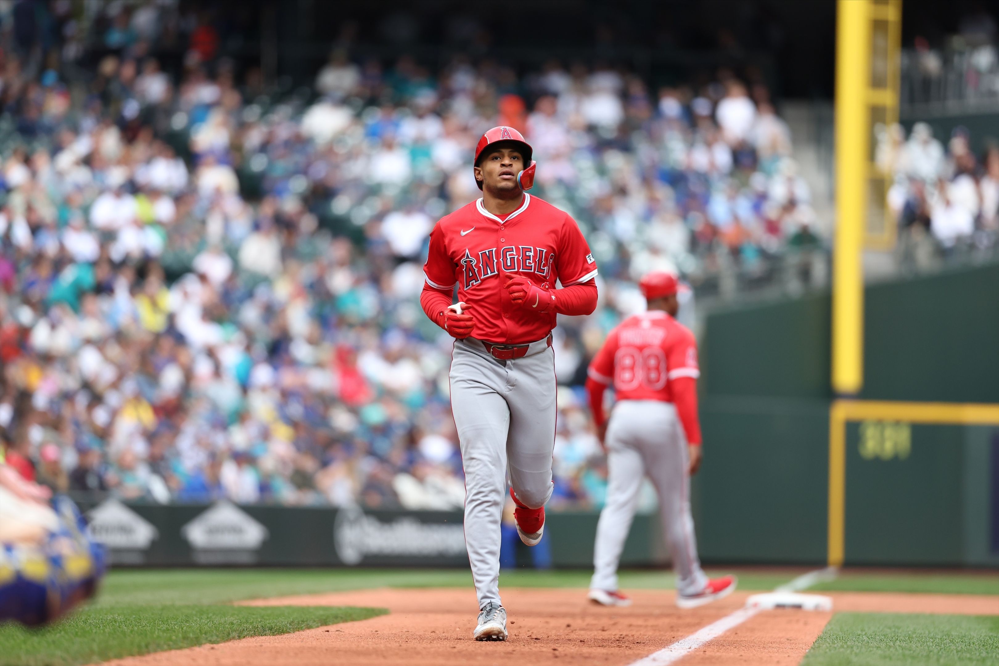 Moore – Drafted 8th overall by the Angels in 2024, No. 1 prospect at call-up, played 57 games for Rocket City before MLB debut, recorded first MLB hit at Yankee Stadium near his hometown.