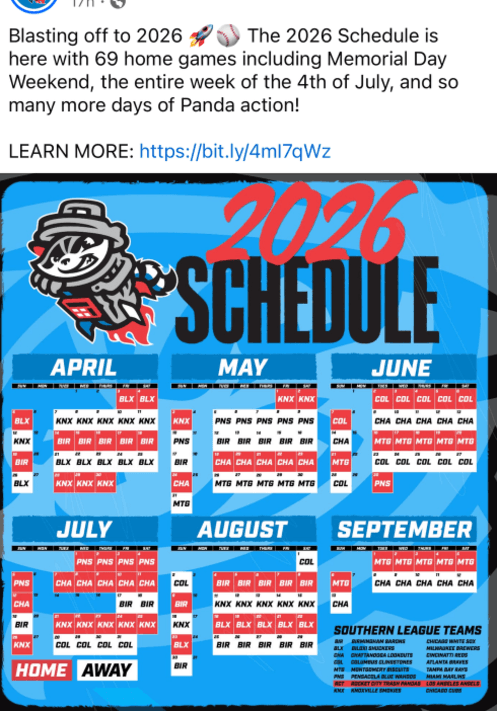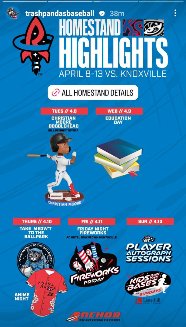 From January through August 2025, the Rocket City Trash Pandas generated 41.3 million social media impressions—an average of 5.2 million per month—ranking second among all Double-A clubs and ninth across Minor League Baseball. The team’s combined audience on Facebook, Instagram, and X grew by 10% this year to 215,955 followers. Since debuting in 2021, the Trash Pandas have surpassed 200 million total impressions, establishing themselves as one of the most consistently engaging brands in MiLB.