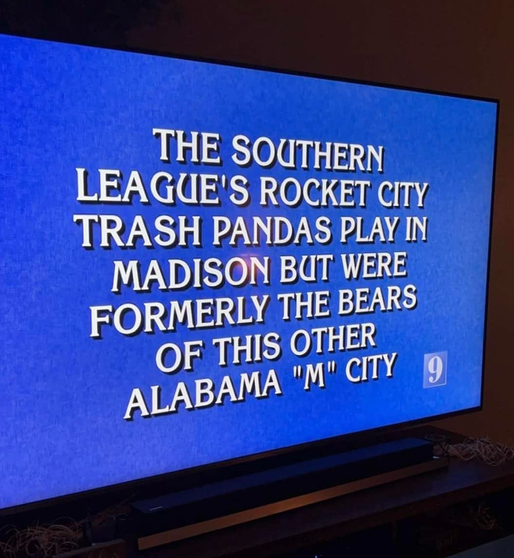 The Trash Pandas were featured on Jeopardy! this year with a clue that read: “The Southern League’s Rocket City Trash Pandas play in Madison but were formerly the Bears of this other Alabama ‘M’ city.” The correct response: What is Mobile?
